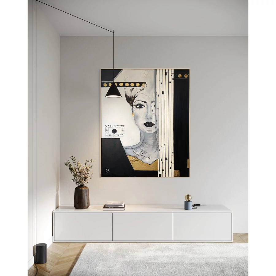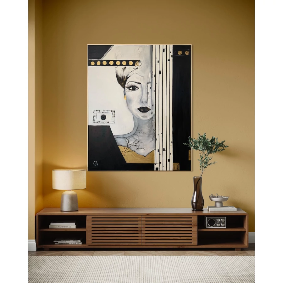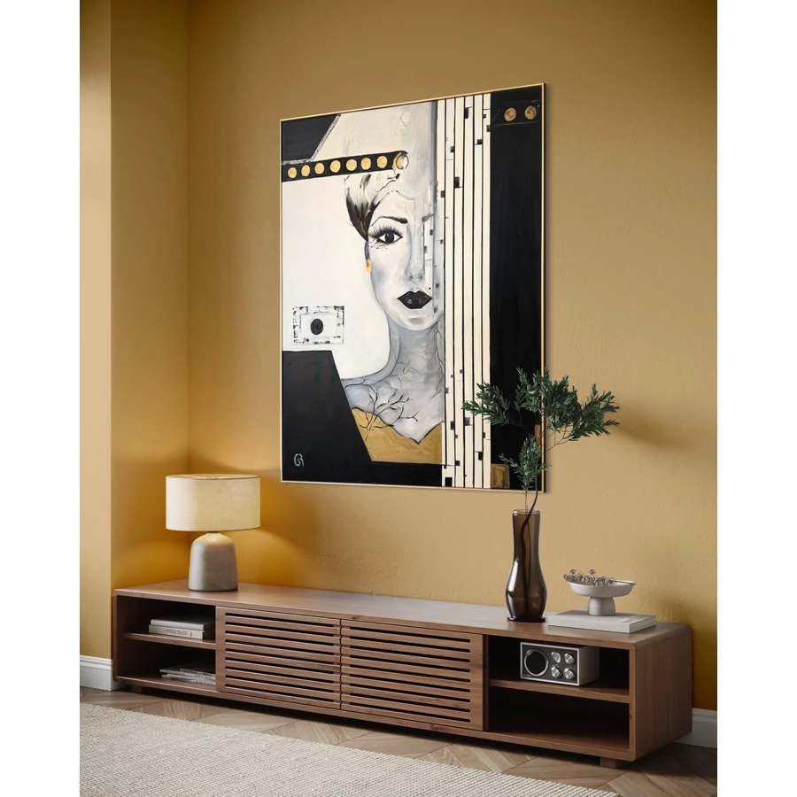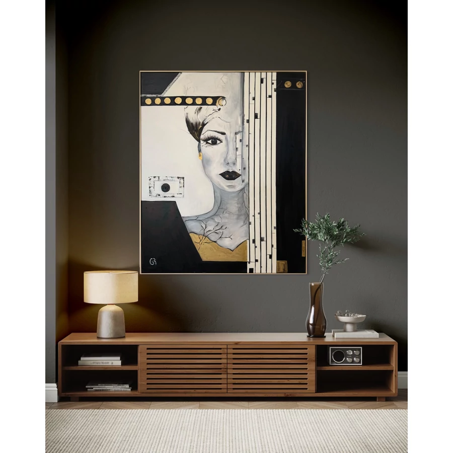A festmény központi eleme egy női arc, amely félig rejtve van egy függönyszerű, fekete-fehér csíkos elem mögött. Az arc egyik fele lágy, érzelmekkel teli, míg a másik oldal geometriai formákba burkolózik, mintha egy másik, rejtett világba nyílna. Az egyetlen szem, amely megjelenik a vásznon, mély és intenzív tekintettel néz vissza, mintha egy titokzatos történetet szeretne elmesélni a szemlélőnek. Ez a tekintet magával ragadó és egyben misztikus is, megidézve a rejtett érzéseket és gondolatokat, amelyeket mindannyian magunkban hordozunk.