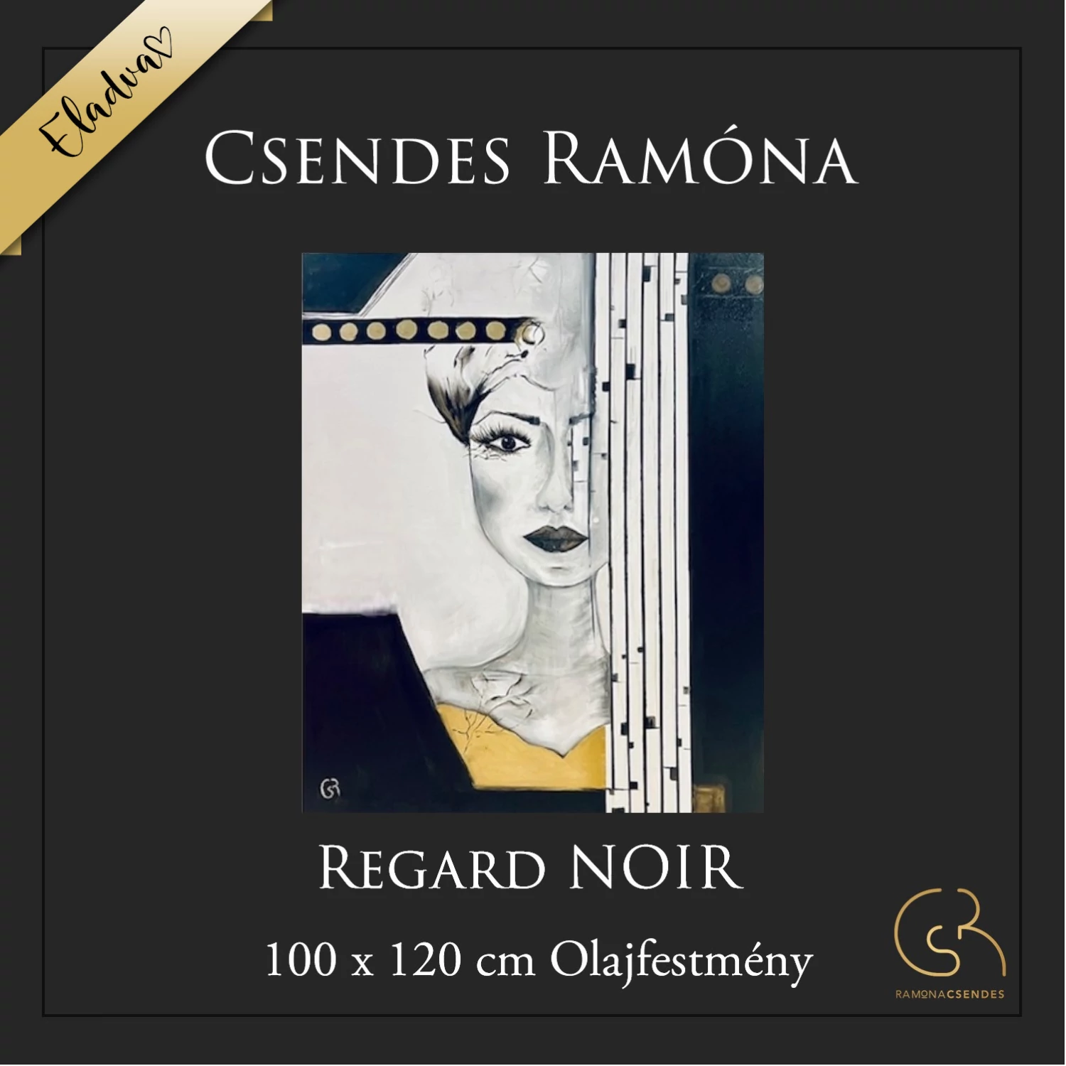 A Regard Noir egy 100 x 120 cm-es olajfestmény, amely Csendes Ramóna művészi látásmódját tükrözi. Ez a festmény az absztrakt művészet és a modern portré találkozása, amely egyedülállóan ötvözi a geometrikus elemeket és a finom vonásokat, hogy felfedje az emberi lélek mélyebb rétegeit.
