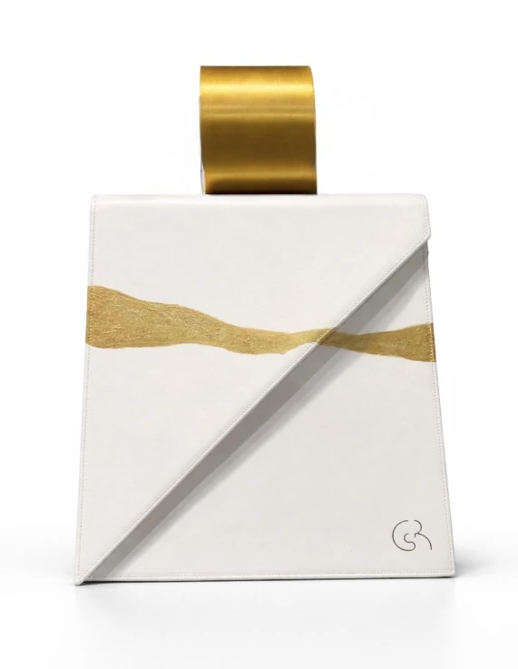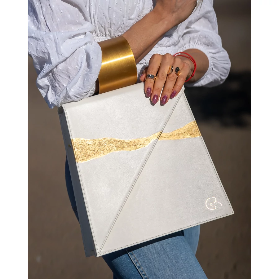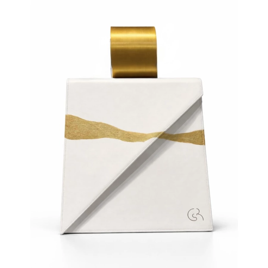 Geometrikus, letisztult formája nyugalmat sugároz, miközben a kézzel festett, arany árnyalatú motívum diszkrét hangsúlyt ad a felületnek. Ez a táska nem harsány – jelenléte mégis erős.